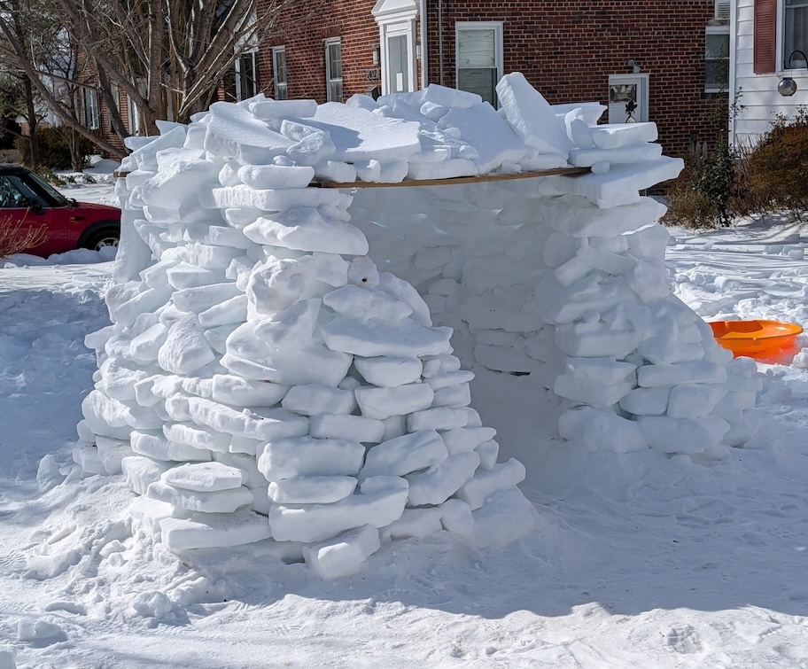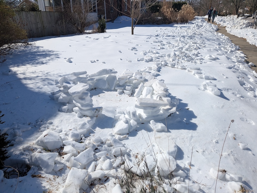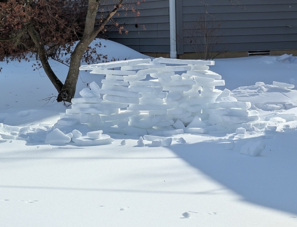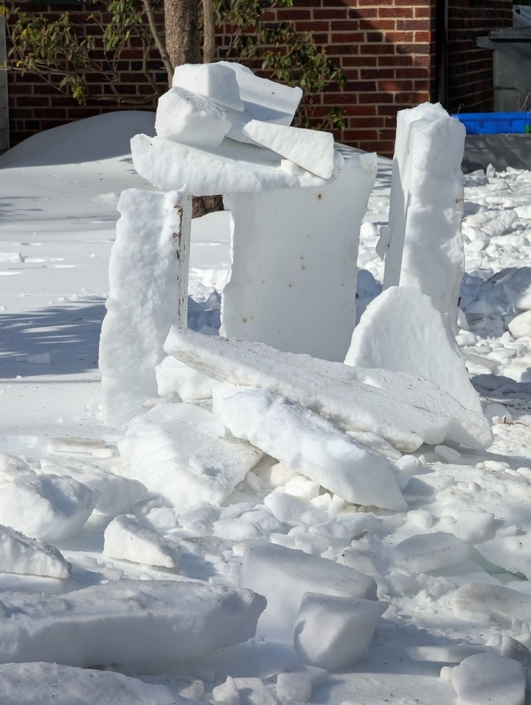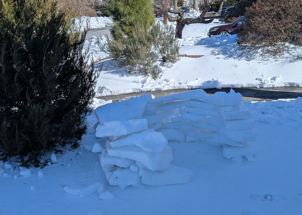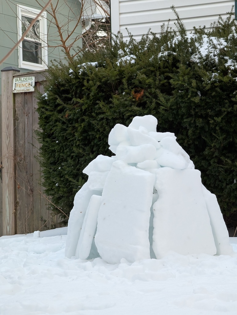 Judge’s Note: The January 25 storm’s particular makeup of icy precipitation–powdery snow followed by several inches of sleet–has enabled a usually-rare-around-here form of snow art involving creative stacking and placement of “sleet blocks,” distinctive for its angularity. Who knows if we’ll have such awesome igloo-building conditions ever again? And commendations for the creative use of tools (garden shovels, propane blow torch, boxes, bucket, and more) and materials (branches, wood planks, backyard patio items) to construct a number of the snow art winners.