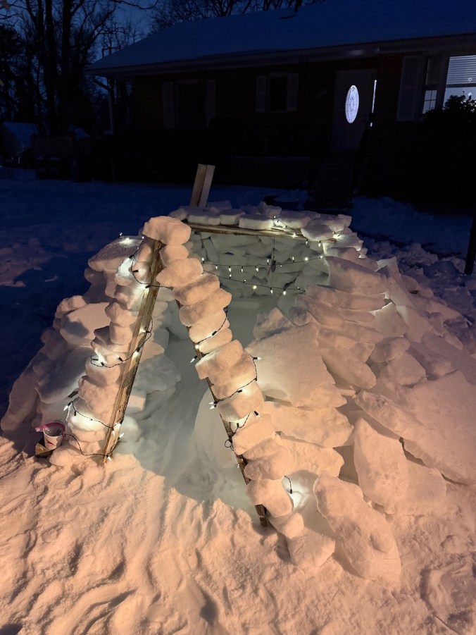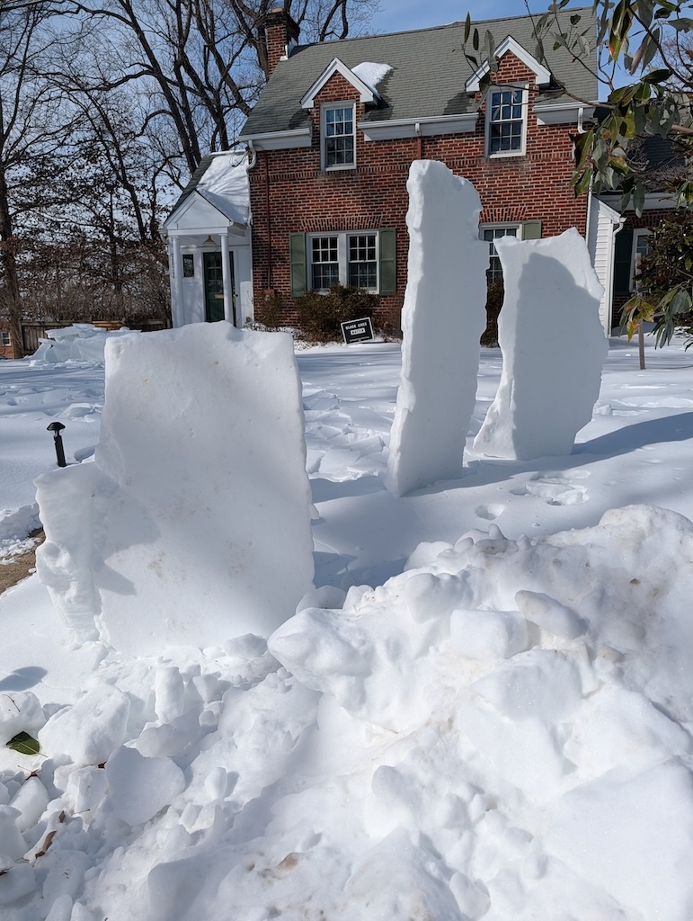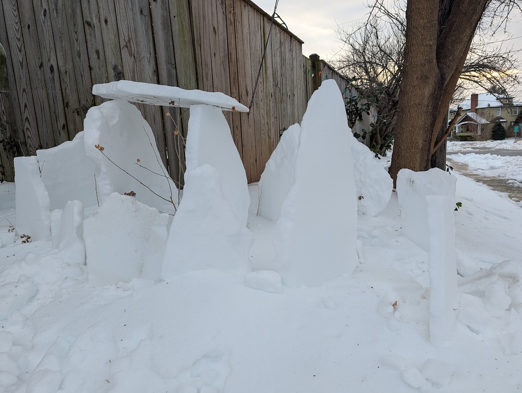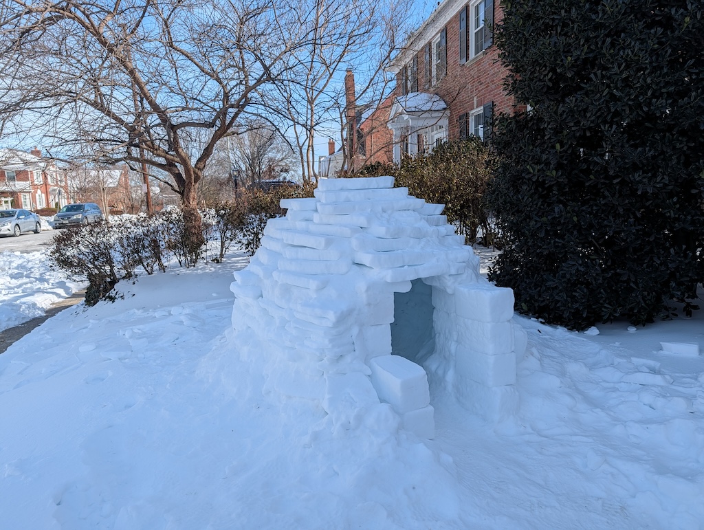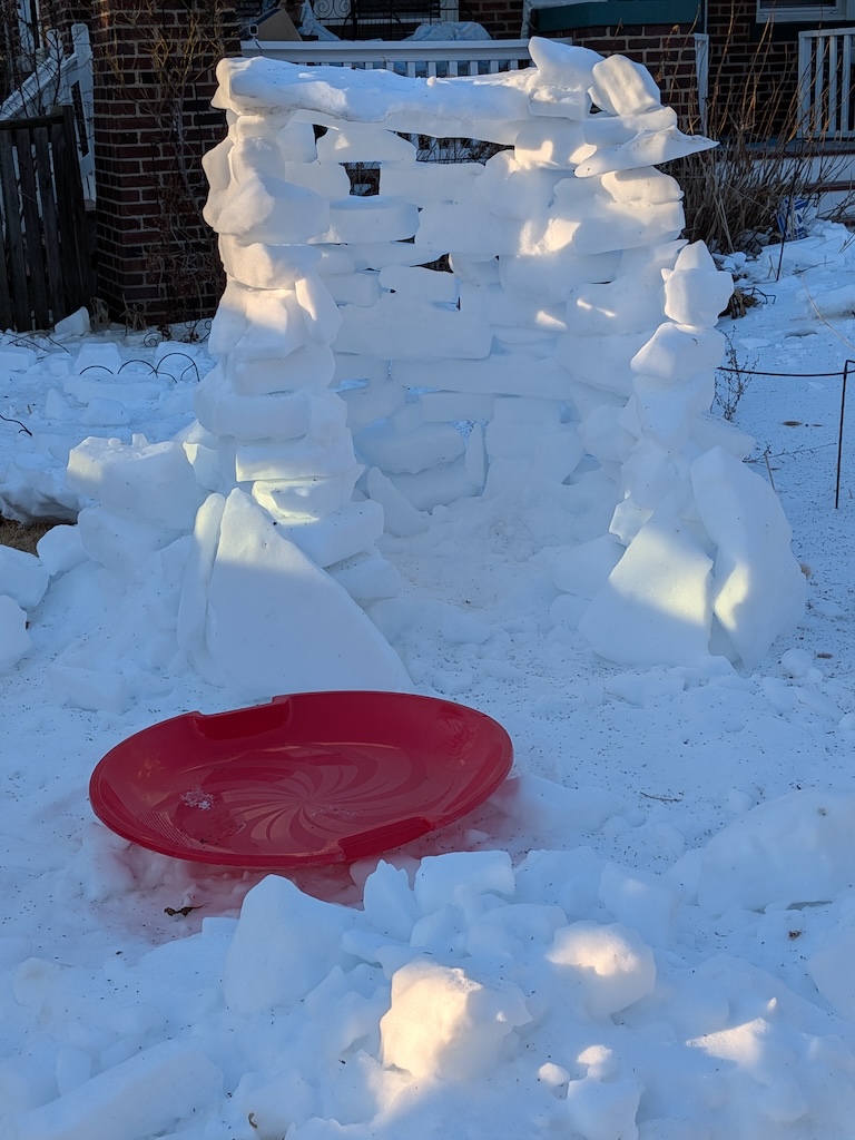 Judge’s Note: The January 25 storm’s particular makeup of icy precipitation–powdery snow followed by several inches of sleet–has enabled a usually-rare-around-here form of snow art involving creative stacking and placement of “sleet blocks,” distinctive for its angularity. Who knows if we’ll have such awesome igloo-building conditions ever again? And commendations for the creative use of tools (garden shovels, propane blow torch, boxes, bucket, and more) and materials (branches, wood planks, backyard patio items) to construct a number of the snow art winners.