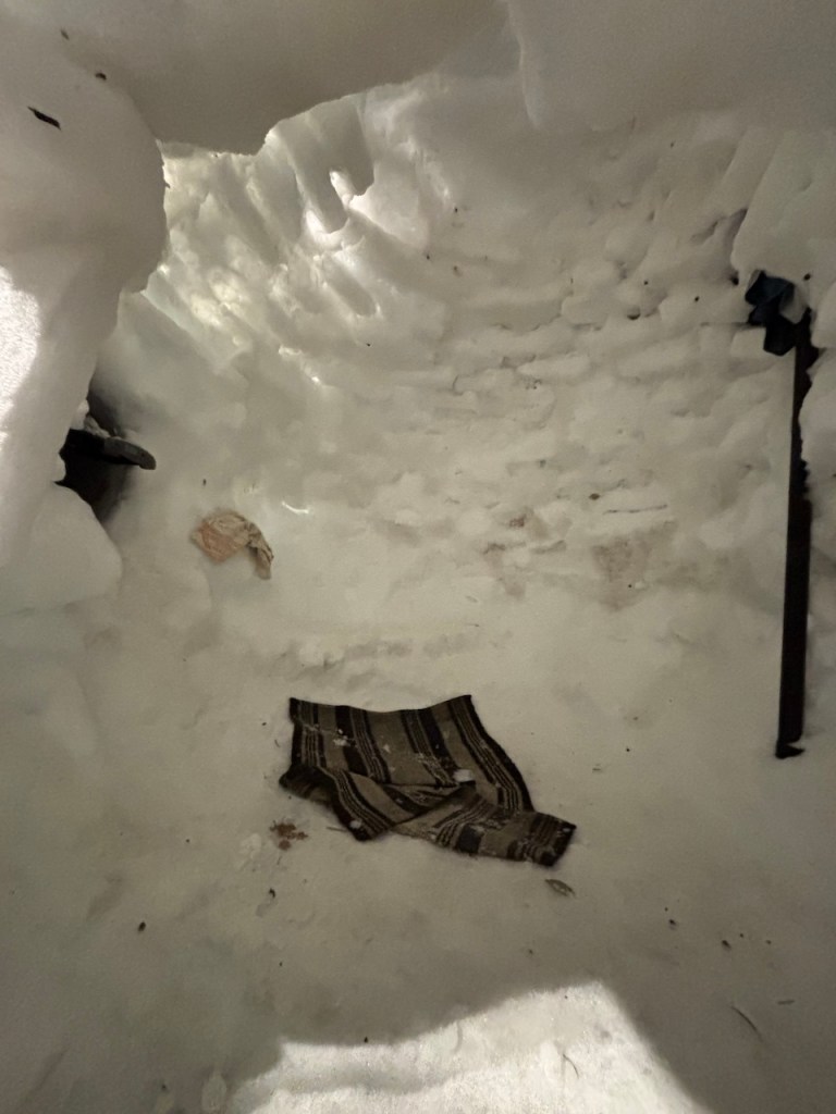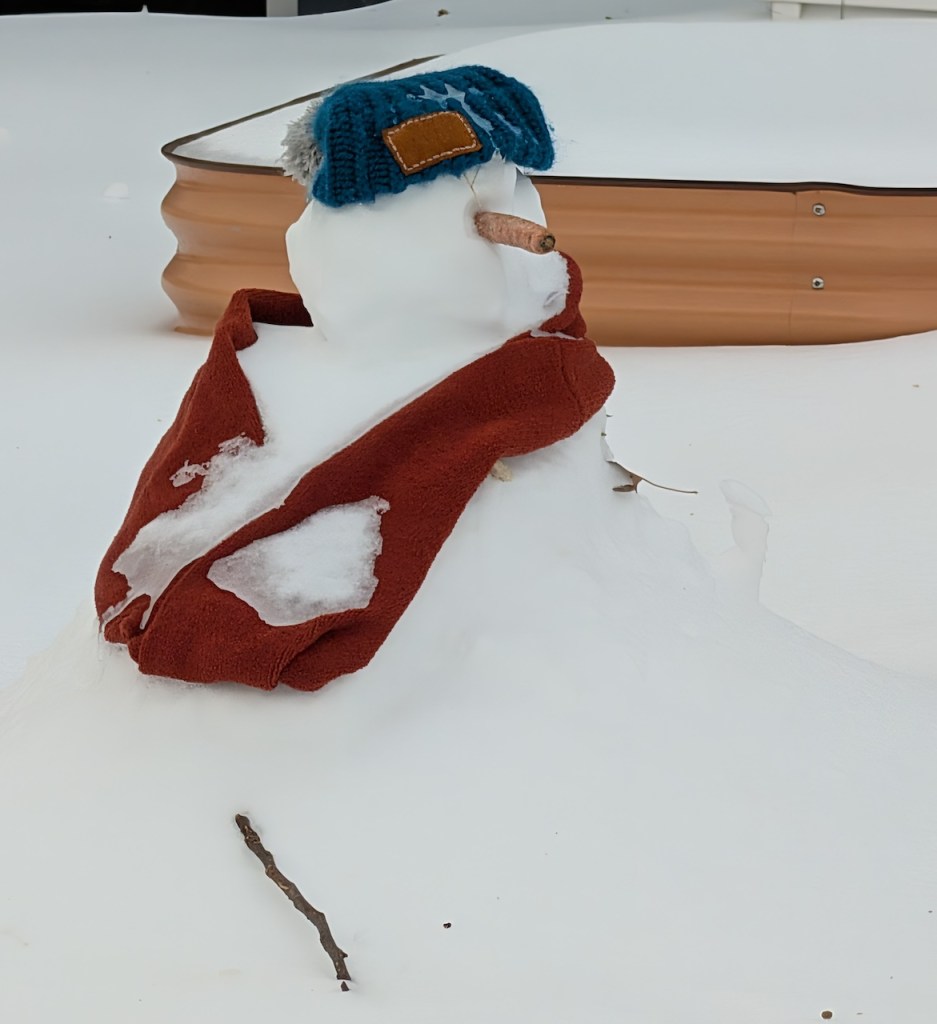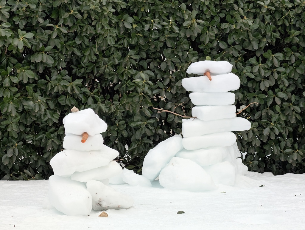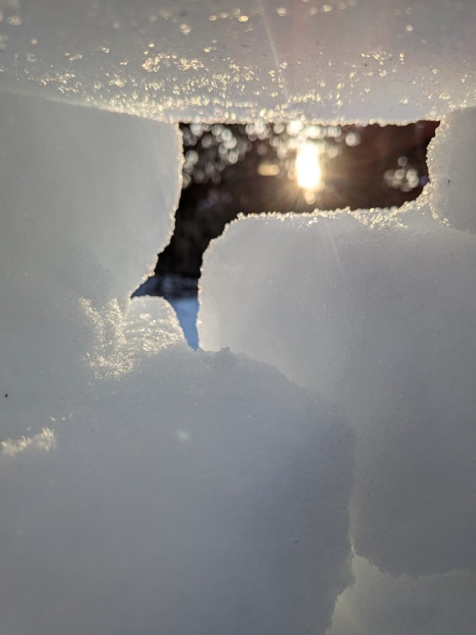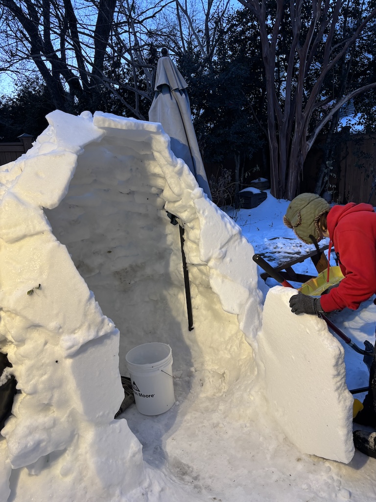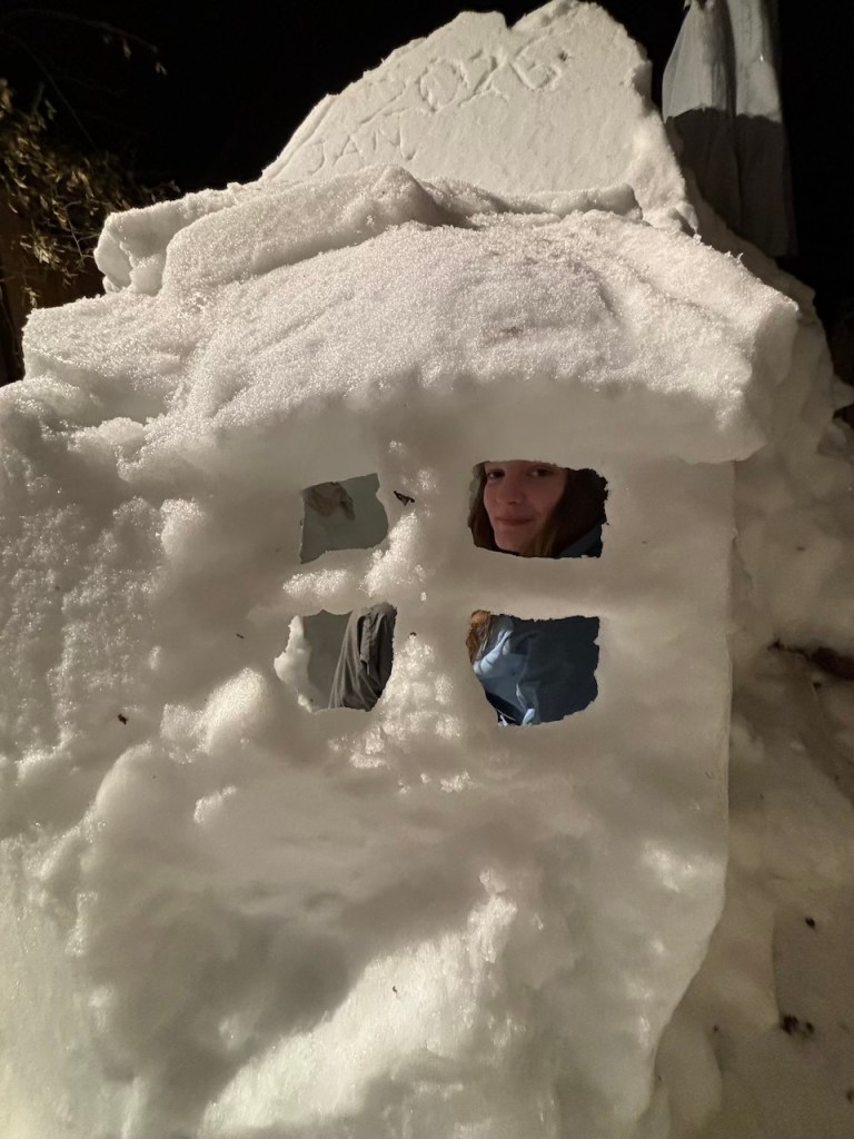 Judge’s Note: The January 25 storm’s particular makeup of icy precipitation–powdery snow followed by several inches of sleet–has enabled a usually-rare-around-here form of snow art involving creative stacking and placement of “sleet blocks,” distinctive for its angularity. Who knows if we’ll have such awesome igloo-building conditions ever again? And commendations for the creative use of tools (garden shovels, propane blow torch, boxes, bucket, and more) and materials (branches, wood planks, backyard patio items) to construct a number of the snow art winners.