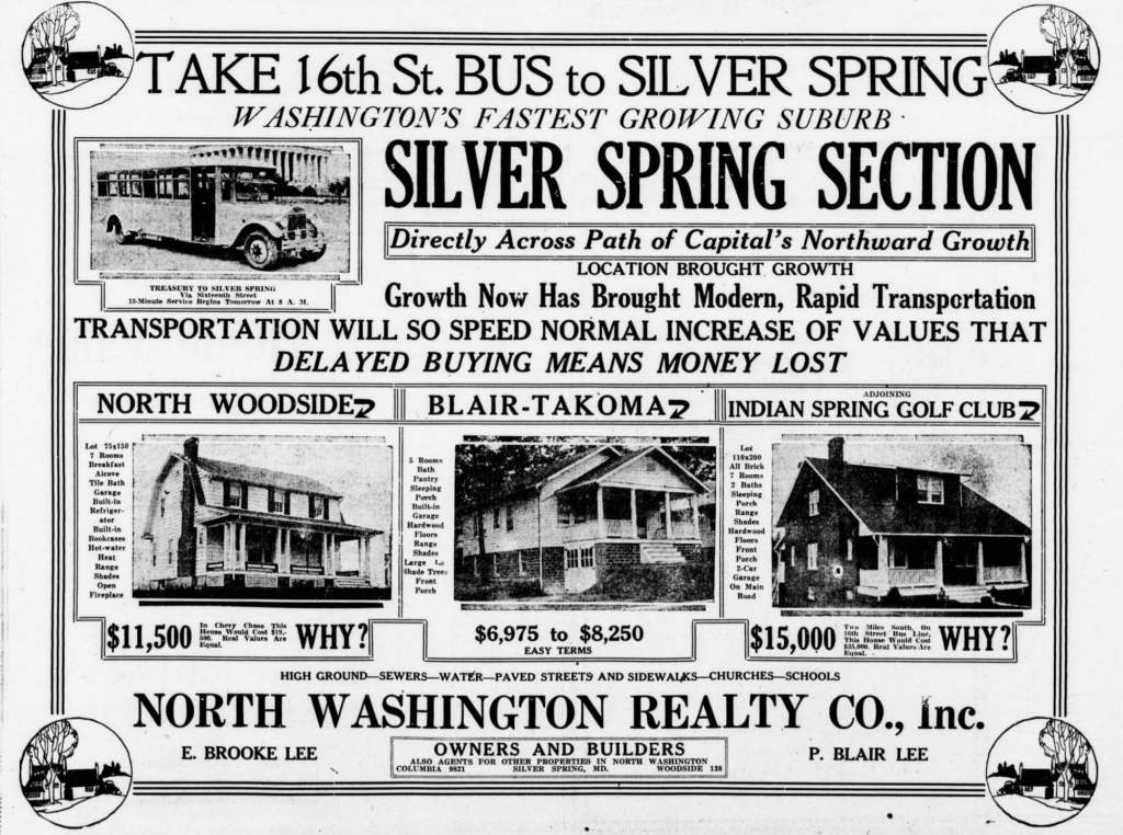 Early advertisements for the neighborhood painted an idyllic picture…“There is no spot adjacent to Washington where the features of the suburbs and all the facilities of the city meet in such perfect accord as in this splendid development at North Woodside, Maryland”…but there is a dark side to these glowing descriptions of the newly developing North Woodside. Like many other neighborhoods in the Silver Spring area at the time, North Woodside had racially restrictive deed covenants that prevented Black people from owning property or living in the neighborhood, except as domestic servants.