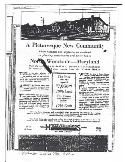 In a 1926 advertisement in the Washington Evening Star (right), North Woodside was described as “A Picturesque New Community, Where hominess and happiness are combined in pleasing environment and pretty homes” and a “straightaway 20 minute leisure drive from the White House.” At that point, 50 homes had “been erected, sold and occupied, with another group in the final stage of completion.” The price for these houses? $7,950 (10% cash). Yes, seems there’s been a bit of inflation since!