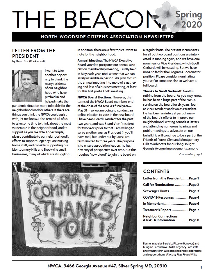 The North Woodside Citizens Association publishes a newsletter called The Beacon, which comes out three times a year (Fall, Winter, Spring). The newsletter is printed and delivered throughout the neighborhood by volunteers.