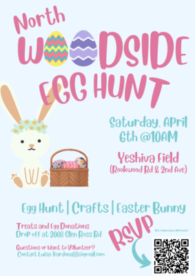 🌷🐰🎉 Happy spring! Get ready to hop into the season with our North Woodside Egg Hunt on Saturday, April 6th. Activities will start at 10:00 am, with the egg hunt starting at 10:30 am. We will also have spring crafts and the Easter Bunny. Feel free to bring along a picnic or some goodies to share with your fellow neighbors or just stop by to say “hi”. And please share this invite with all our neighbors, all are welcome to join the festivities.