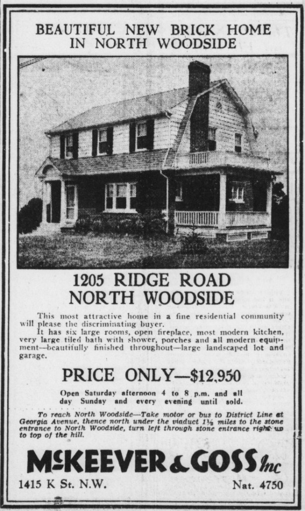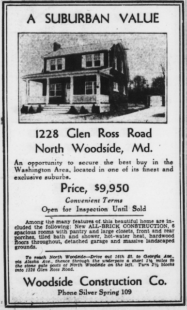 On February 16, 2022, many neighbors tuned into an online training by Kirsten L. Crase, PhD, University of Maryland, on how to research the history of their homes. The training inspired a search of historic newspaper digital archives for articles related to the neighborhood. Among many fascinating finds, neighbors uncovered a plethora of original advertisements for North Woodside homes. Can you find these homes today?