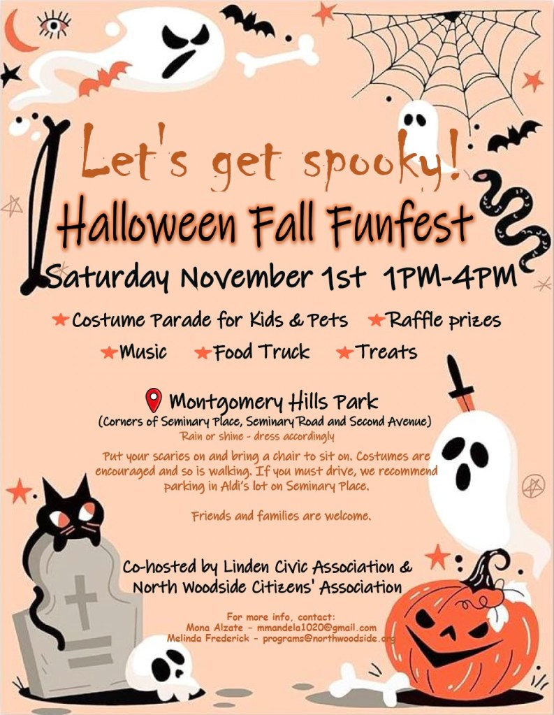 On November 1, 2025, the Linden and North Woodside civic associations came together once again to host a festive neighborhood Halloween celebration filled with fun and seasonal cheer. Families, kids, and pets showed off their costumes in lively parades, while live music set the perfect backdrop for an afternoon of relaxed, community-centered fun, with great food, happy neighbors, and plenty of chill vibes. At a time when togetherness matters more than ever, the event was a great reminder of the importance of the strength that comes from being united and supporting one another. Thank you to everyone who participated in the event and made it a memorable time. — Mona Alzate, NWCA event volunteer