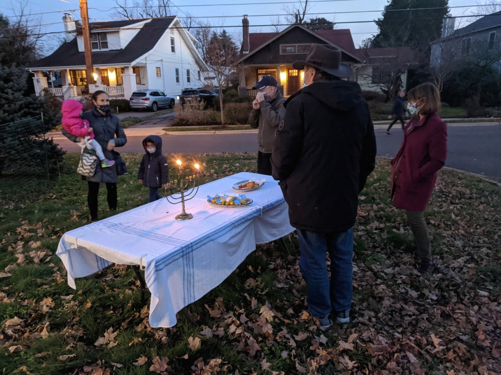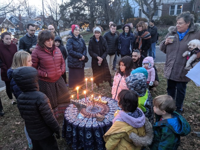 Sheva Melmed leads neighborhood kids in the lighting of menorahs at the 2nd Annual Menorah Lighting on December 22, 2019. Special thanks to Merrie Blocker for organizing and preparing the yummy cider and latkes!