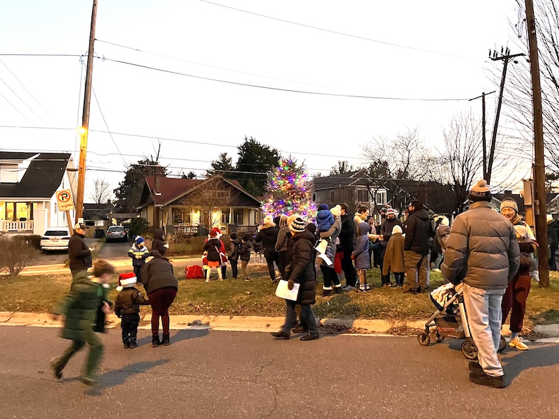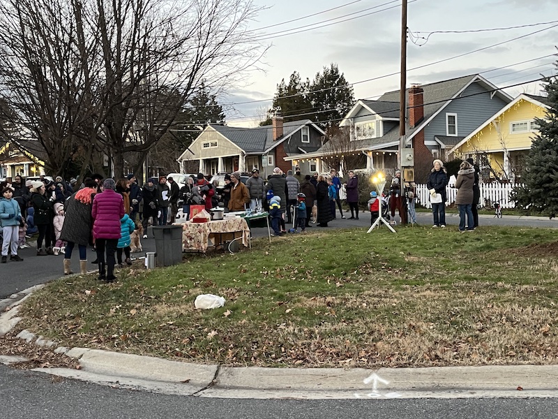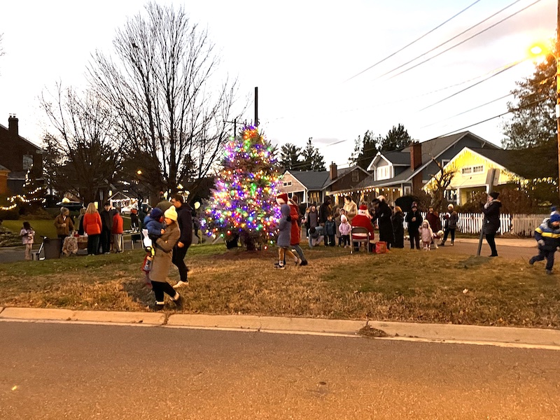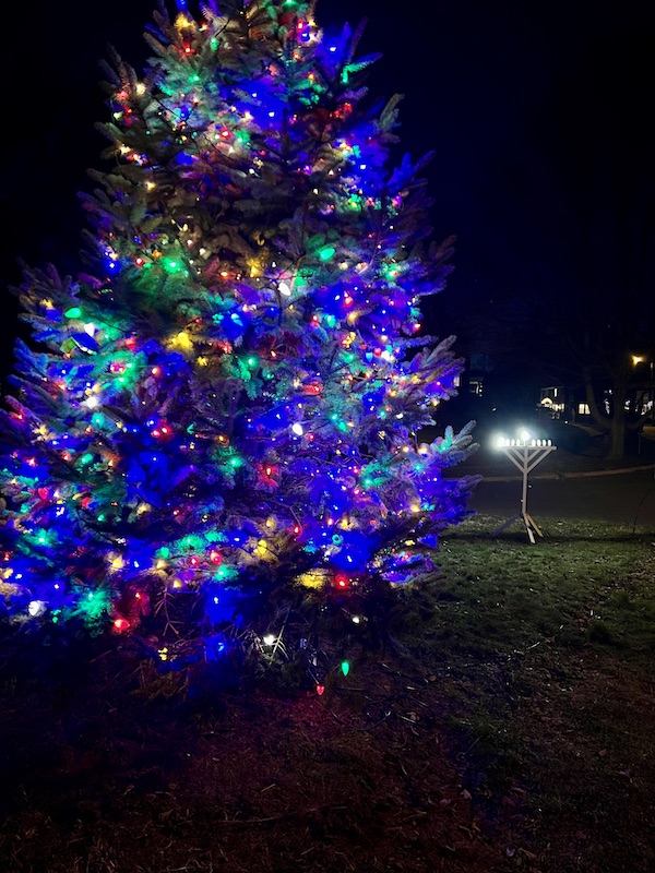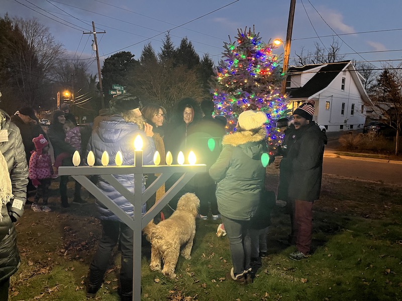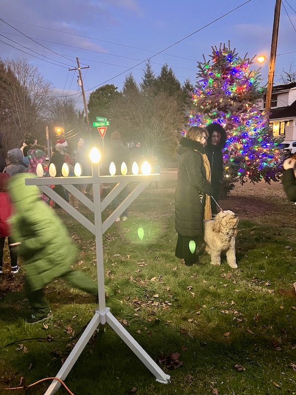 On December 18, 2022, neighbors gathered at the Community Tree Triangle for the 74th Annual Tree Lighting and 5th Annual Menorah Lighting and enjoyed hot cider and latkes. Photo by Phyllida Paterson