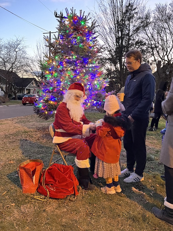 The rain abated and a good number of neighbors gathered to eat latkes and drink hot cider, hear beautiful choral holiday songs by the Tree Singers, and have a visit with and treats from Santa!