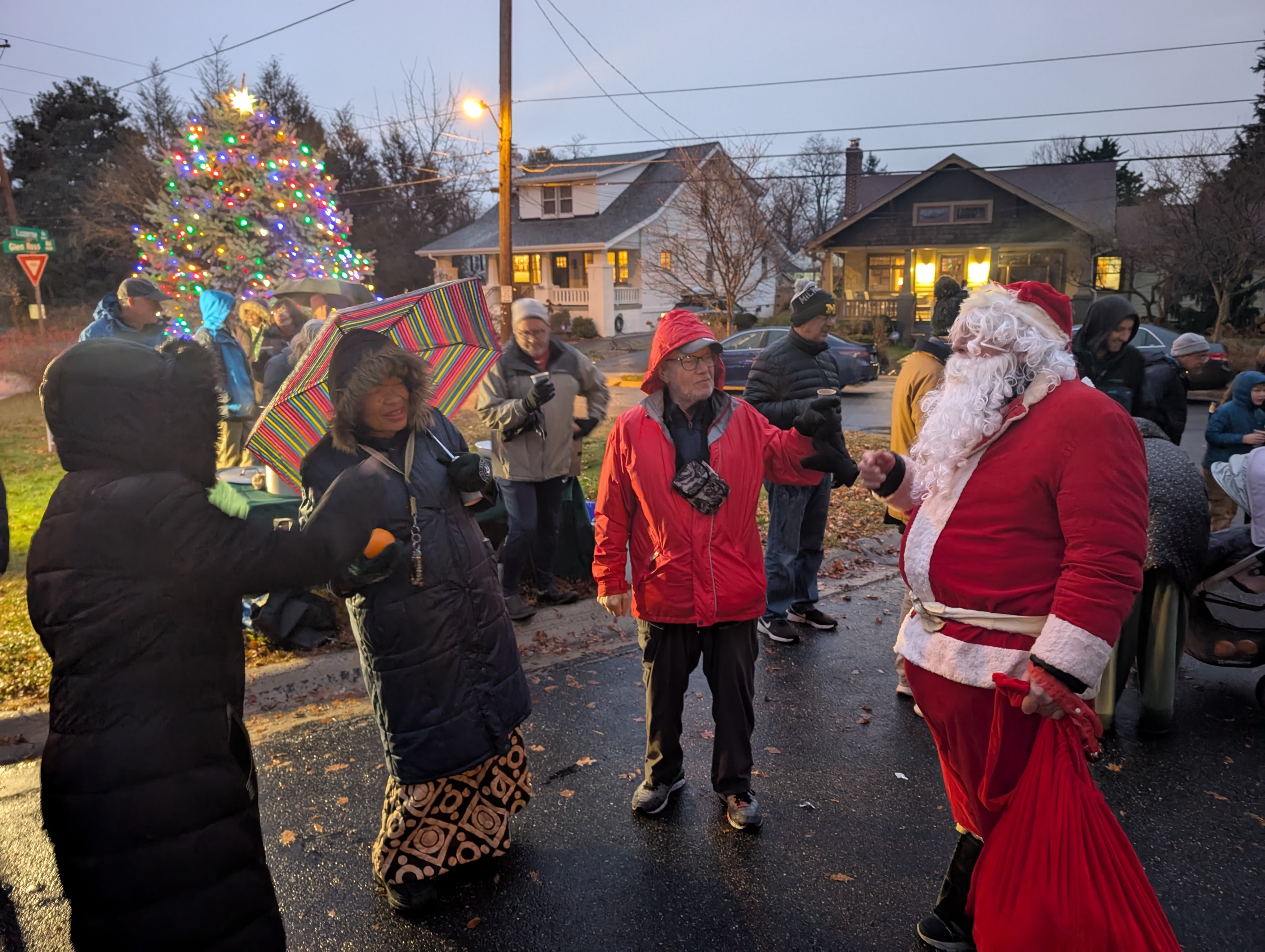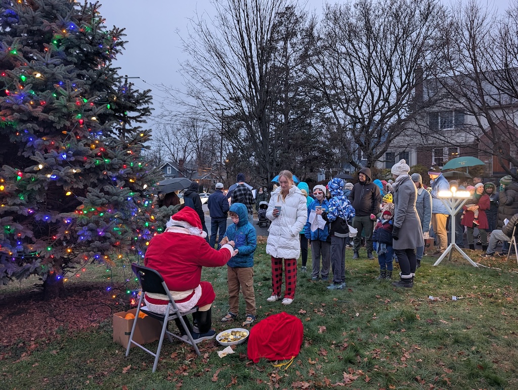 The celebration begins at sundown with the lighting of the menorah, a holiday singalong and tree lighting, visit from Santa Claus, and refreshments, including latkes (potato pancakes) and hot cider. Scroll down for the program and song sheet.